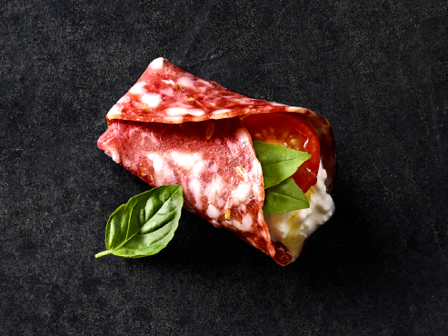 1. Take a Finocchiona slice and use it as the “plate” in your hand.
